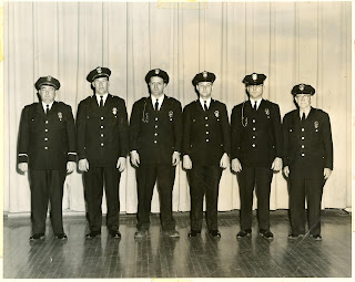 Chief Drury saw the article and sent us the names of the two unknown officers! He has a copy of the photo as well, with the names written on the back. So from left to right : Carl Worcester, Joe Vachon, Alden Jenness, Walt Clifford, Kenneth Furbush, and Charlie Davis. Thank you Chief Drury for identifying the unknown officers !